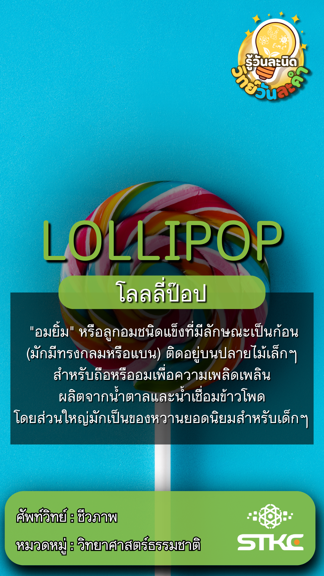 "อมยิ้ม" หรือลูกอมชนิดแข็งที่มีลักษณะเป็นก้อน(มักมีทรงกลมหรือแบน) ติดอยู่บนปลายไม้เล็กๆ สำหรับถือหรืออมเพื่อความเพลิดเพลินผลิตจากน้ำตาลและน้ำเชื่อมข้าวโพดโดยส่วนใหญ่มักเป็นของหวานยอดนิยมสำหรับเด็กๆ
