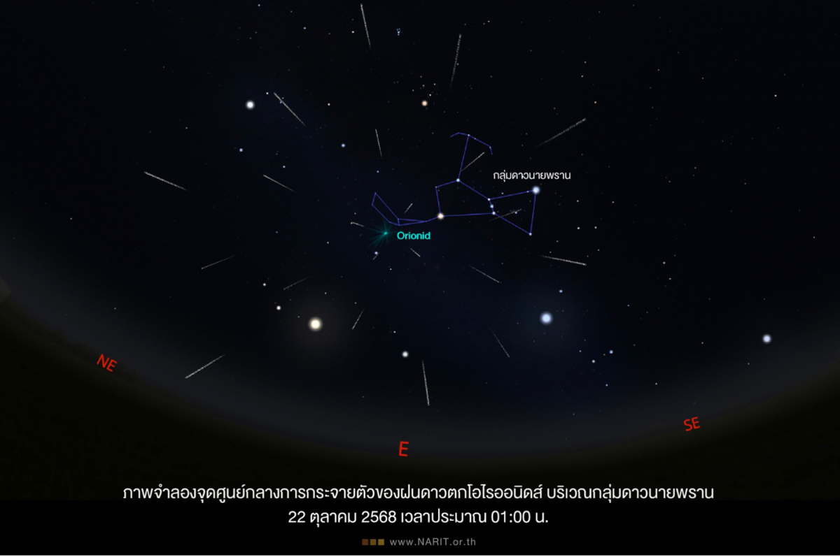 นายศุภฤกษ์ คฤหานนท์ ผู้ช่วยผู้อำนวยการสถาบันวิจัยดาราศาสตร์แห่งชาติ เปิดเผยว่า “ฝนดาวตกโอไรออนิดส์” หรือฝนดาวตกในกลุ่มดาวนายพราน จะเกิดขึ้นในช่วงวันที่ 2 ตุลาคม ถึง 7 พฤศจิกายน ของทุกปี สำหรับในปี 2568 คาดว่ามีอัตราการตกสูงสุดเฉลี่ยประมาณ 20 ดวงต่อชั่วโมง ในคืน 21 ต่อเนื่องถึงรุ่งเช้า 22 ตุลาคม 2568 เริ่มสังเกตการณ์ได้ตั้งแต่เวลาประมาณ 22.30 น. ของวันที่ 21 ตุลาคม 2568 โดยจุดศูนย์กลางการกระจายตัวของฝนดาวตกจะอยู่บริเวณแขนของกลุ่มดาวนายพราน ปรากฏขึ้นทางทิศตะวันออก จากนั้นจะค่อย ๆ เคลื่อนสูงขึ้นสู่บริเวณกลางท้องฟ้า และสามารถเฝ้าชมได้ตลอดทั้งคืนจนถึงรุ่งเช้า