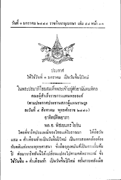 ครั้งที่ 4 วันขึ้นปีใหม่ของไทยตรงกับ วันที่ 1 มกราคม ตรงกับรัชสมัยของพระบาทสมเด็จพระปรเมนทรมหาอานันทมหิดล พระอัฐมรามาธิบดินทร รัฐบาลจอมพล ป. พิบูลสงคราม เห็นว่าเมื่อไทยยอมรับปฏิทินสุริยคติตามแบบสากลแล้ว ก็ควรเปลี่ยนวันขึ้นปีใหม่ให้เป็นแบบสากลเพื่อความสะดวกในการติดต่อกับต่างประเทศ จึงกำหนดให้ถือวันที่ 1 มกราคมของทุกปีเป็นวันขึ้นปีใหม่เริ่มตั้งแต่พุทธศักราช 2484 เป็นต้นมา ส่งผลให้พุทธศักราช 2483 มีจำนวนเดือนเพียง 9 เดือนขาดไป 3 เดือน